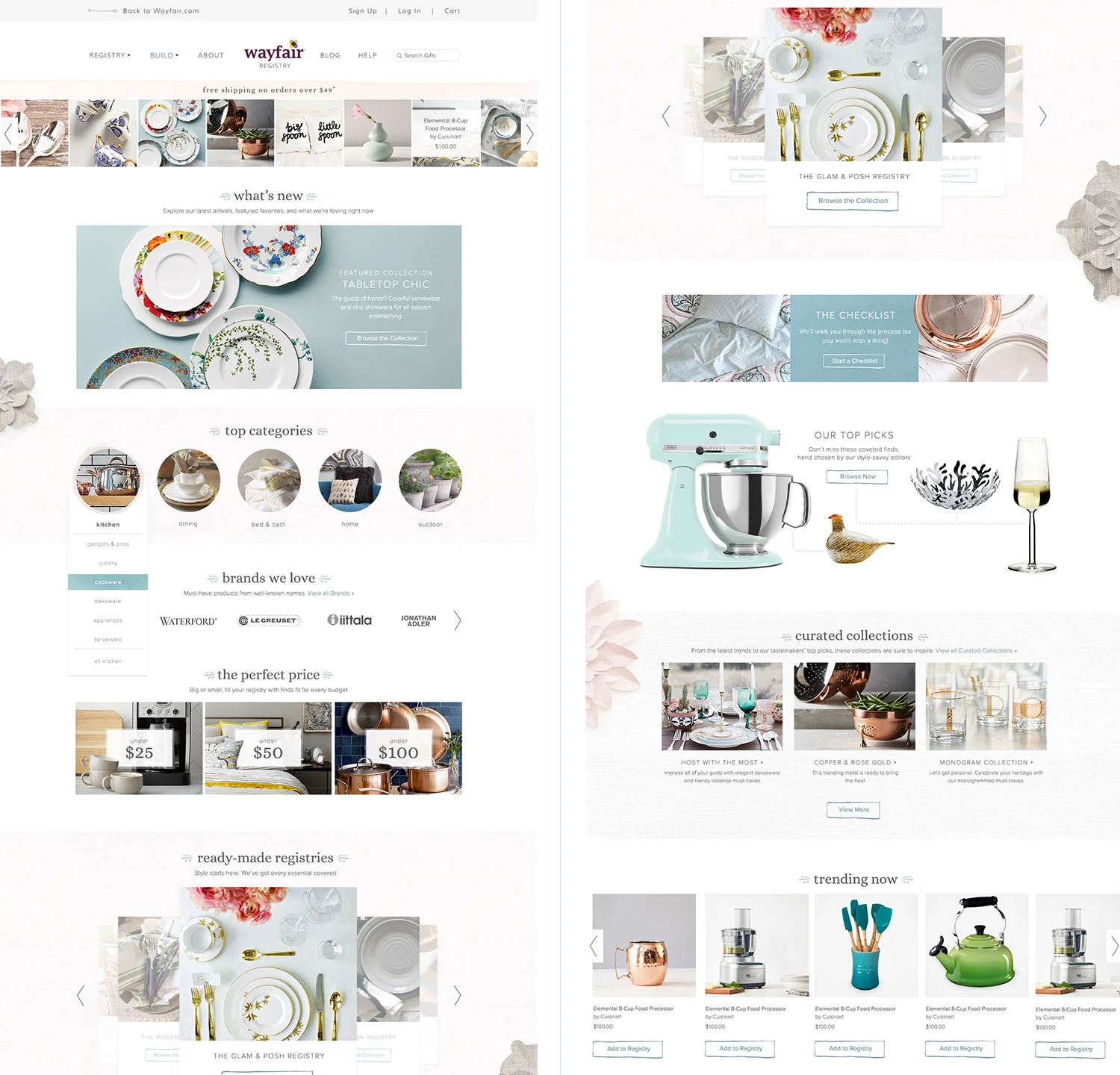 For the Website we looked at millennial sites for inspiration. We wanted to incorporate a lot more white space than the Wayfair.com site. Below are a couple mocks for the Registry site.